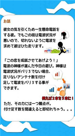 《恋爱满格(恋のバリ3愛しTEL)》是一款跑酷反应类休闲小游戏,这款游戏操作非常简单,只需要点击三个按钮即可,游戏过程中主人公身处在一个信号非常之恶劣的地方,为了寻求信号他需要一直往前跑,而且反人性的是越跑越快,在奔跑过程中会路过各种信号基站,路过这些基站时候我们需要将下方的三个按钮和基站所出现的标示统一就OK了。