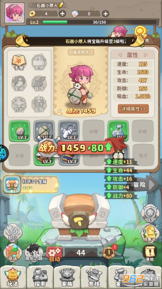 《冒险与召唤》是一款休闲放置的开箱小游戏,玩家将作为生活在石器时代的小原人,与众多远古异兽为伴。但不需要通过对抗远古怪物获得装备,也不需要闯过一个个难关提升等级,只要不停的打开眼前的宝箱,各种远古神级装备唾手可得,游戏中还有各种上古坐骑,可爱萌宠与你一起探险石器时代,使你可以充分感受石器时代的魅力。