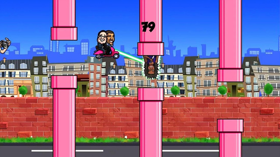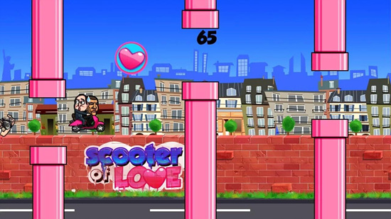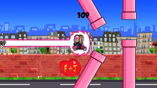 《总统搞基记(Scooter of Love Hollande Obama)》是一款恶搞风的简单休闲游戏,美国总统奥巴马和法国总统奥朗德的家庭生活都很不爽,他们呢决定去搞基!开上奥朗德的偷情小摩托,躲开凶暴的夫人们!这是一个类似于Flappy Bird的小游戏,但是玩法还不大一样,首先要打败挡在路上的总统夫人,还要加速前进躲避狗仔队哦。