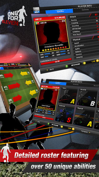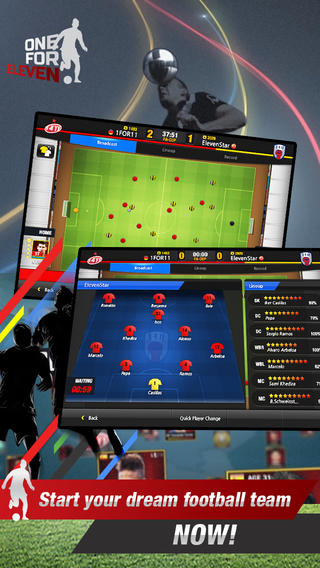 《全明星11人》(One for Eleven)游戏中,玩家可以管理并训练一支足球队,而队员们则是由官方授权的真实球员组成,比如C罗和梅西等等。每一名足球巨星都是根据真实球场上的数据制作的,比如断球能力、精准度、头球能力等等。玩家可以与世界上的其他玩家进行充满真实性的策略对抗。