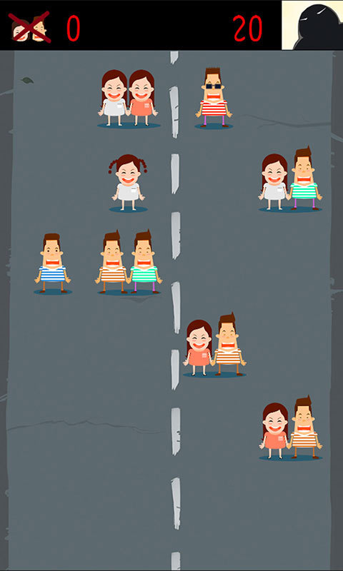 这款游戏应该是所有单身的福利,因为游戏中只需要按死情侣就可以得到分数,最后统计你杀死了多少出双入对的人吧。要记住的就是单人和不是情侣的出行就要注意了,可千万不能点击哦,会让你失败的,游戏中的人长相很相近分辨会有一定的困难,还要细心才好。