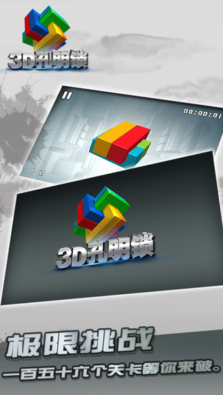 3D孔明锁是一款有史以来最烧脑的真正考验智力的益智类游戏,孔明锁,也叫八卦锁,曾广泛流传于汉族民间的智力玩具。简单的玩法,在其中却蕴含着不平凡的智慧。这是一个真正考验智力的游戏,暴力是解决不了一切的,哪怕你被折磨的砸掉了你的手机!一百五十六个关卡等你来破,难度蹭蹭蹭的往上飙,你确定你行?不服,那就打爆156!