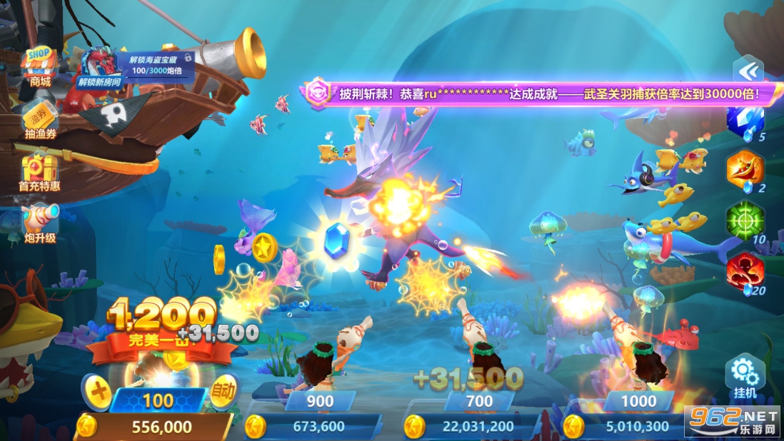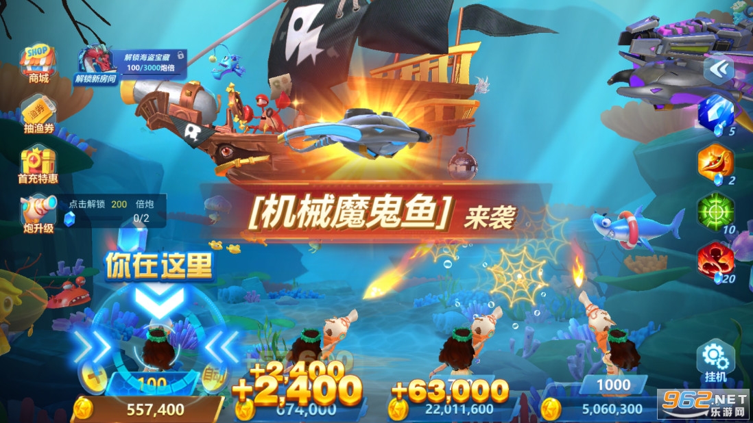 1、用超强千倍炮对抗神秘的海底BOSS,独创技能狂暴分身轰翻全场,无论何种BOSS都一网打尽,称霸深海!