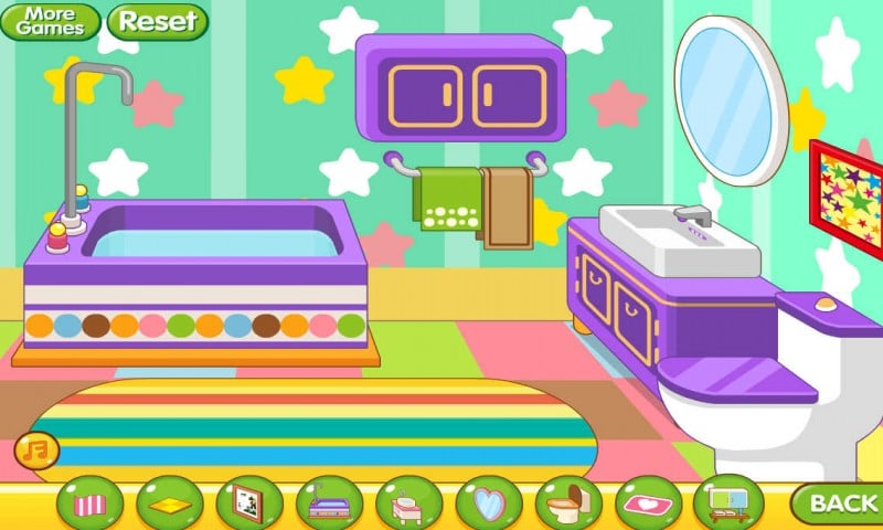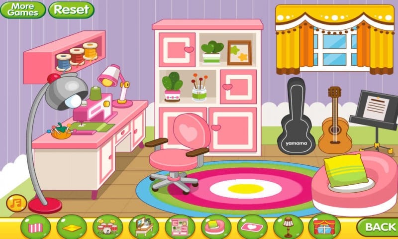 可爱的房间等你来装饰哦,点击下面一排按钮,放置你喜欢的家具,装饰出你的浪漫满屋。一共有五个房间,装饰完一个房间点击back就能回到大房子里,快来试试吧~