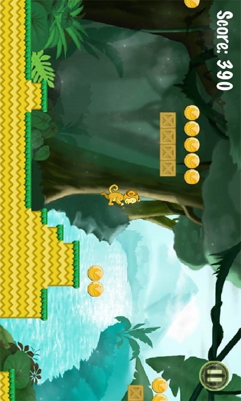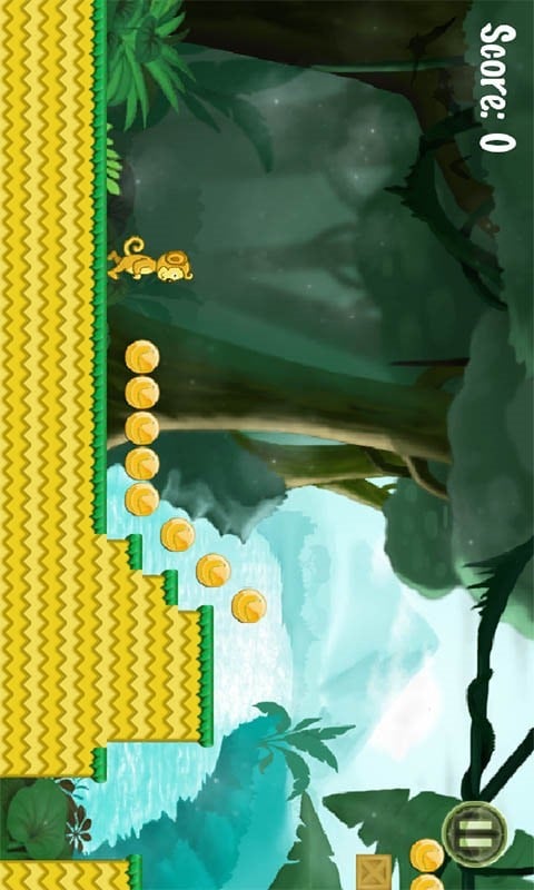 游戏过程是猴子和狮子不断跳跃、跳过空隙和接金币的过程。游戏共有2大场景,每一场景有9个小关卡。