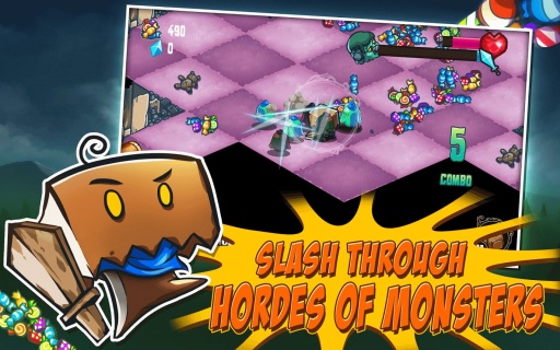 整个游戏场景有着过万圣节的感觉,怪物所掉落的物品都是一些糖果以及鬼怪装扮,主要的操作方式是使用划线来砍杀蜂拥而来的敌人。