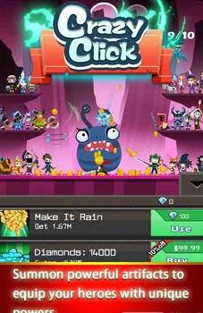 《狂暴点击 Crazy Click》是一款手指休闲游戏,游戏中,你需要疯狂点击屏幕来击杀怪物,通过使用击杀怪物所获得的金币来提升英雄等级和技能等级,并且你还可以招募帮手。