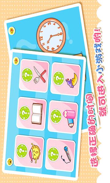 Play1:几点起床?几点吃饭?几点睡觉……每天的生活作息都有它的时间规律,你会识别钟面上所指示的时间么?快来试试吧!
