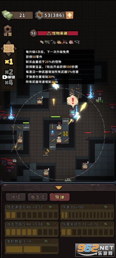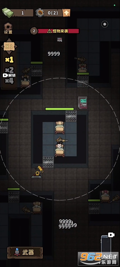 随着轮次增加,怪物的数量会增多,玩家需要消耗钞票或者零件对武器的攻击力、攻击速度等进行升级,抵御轮次越多,获得的钞票和零件奖励也越多。