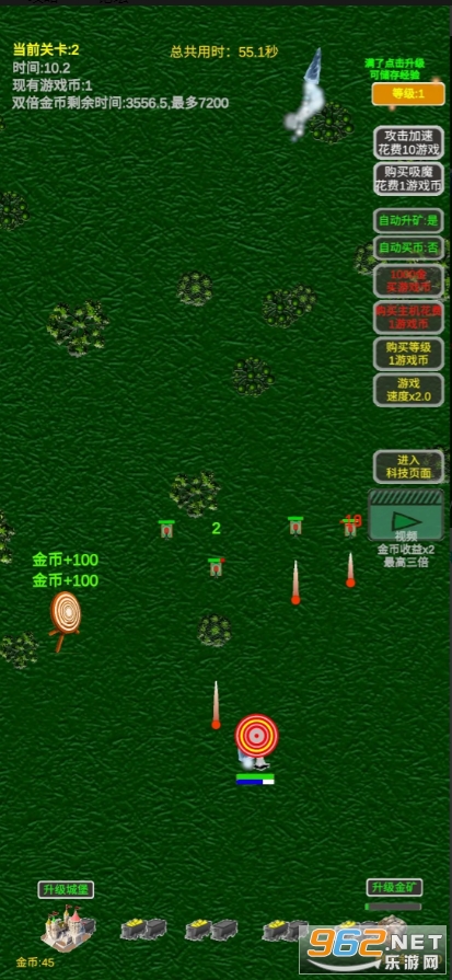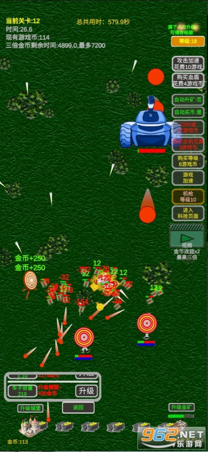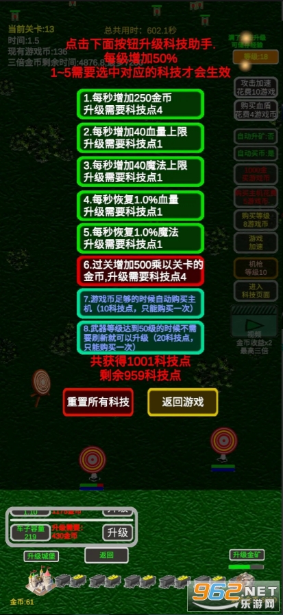 刚玩建议:物理用飞刀(10级能追boss,高级能穿透)血量10级,魔法用火球(10级能追boss,有持续伤害)魔力10级。先选金币科技助手。开始尽量拖长过关时间。打死第一个boss获得1科技点。可以尝试继续往后面打,也可以送死重开(科技点会保留)。科技点升级每秒金币科技。第二个boss会出2科技点,以此类推。