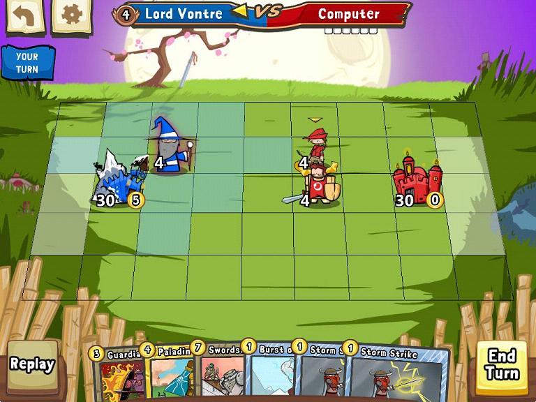 整个游戏界面呈格状,每张卡牌角色能够移动的步数都是有限的,当然,你也可以命令他们攻击某一个目标。卡牌分为角色和道具,角色的能力不同,耗费的金币也不同;而道具也一样,有的可以毁掉数个目标,有的则是给你的士兵增加攻击。