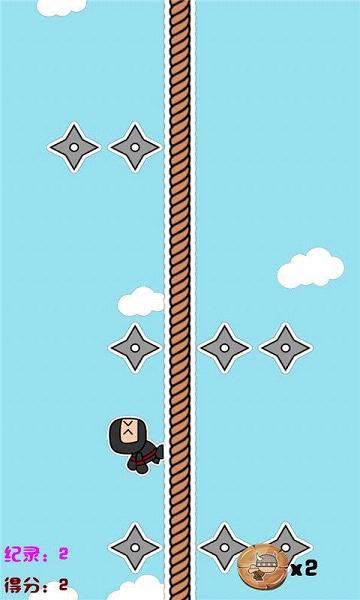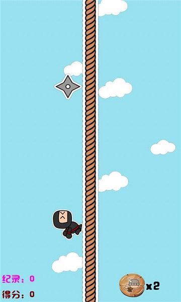 玩家需要点击屏幕来操纵“阿忍”,使其躲避忍者镖。绳子分为左右两侧,点击“阿忍”所在位置的另一侧,阿忍会移动到点击位置的那一侧,点击与“阿忍”位置相同的一侧,“阿忍”会进行跳跃。