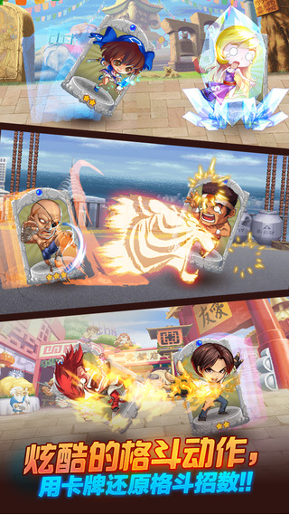 ★ 炫酷格斗动作,用卡牌还原各街机游戏人物的经典招式,熟悉的场景、熟悉的人物造型,怀旧中体现新意,效果更酷、更炫!