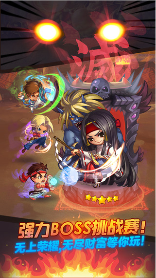 一款经典的策略卡牌手游,游戏集合了拳皇、街霸、侍魂中的人物,收集他们并肩作战,享受游戏的快感!