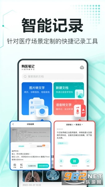 有医笔记是一款帮助医疗行业相关人员实现快捷记录、文档整理的智能工具,具备图片转文字、语音转文字、文档智能管理、多端同步等多种功能。医疗相关从业人员带来更便捷的笔记记录服务,快捷记录,支持语音、文字等多种记录方式,轻松实现图片/语音转文字功能,笔记记录更简单。