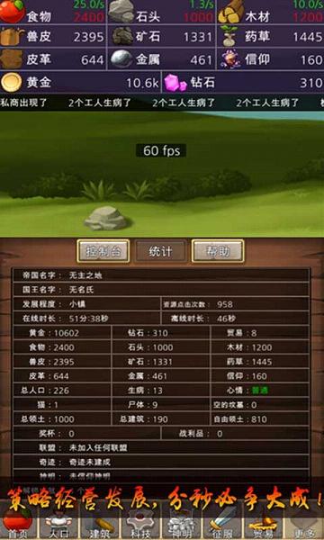 游戏以人类历史文明发展过程为背景,以简单列表的形式向我们展现出势力发展的各方面要素,玩家在游戏中扮演纯粹的智者,以上帝视角俯瞰世界,争取构建最庞大的帝国。