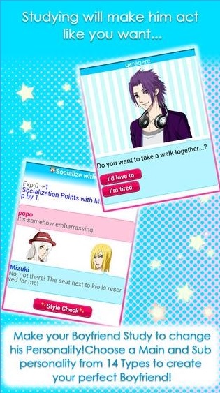 游戏中5例正常人和2种选择的秘密!他们扮演着许多人格类型如“厚颜无耻”“神秘”“傲娇”和更多性格,通过让他学习或工作!同时改变他的脸,头发和衣服!与跟他聊天,约会,情意绵绵!