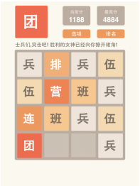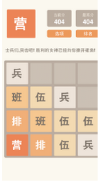 2048军棋版一款以军旗为题材的2048类休闲游戏,在游戏中玩家根据军旗中大小排列进行消除。游戏是由2048改编版而成,实现士兵的突击,屌丝的逆袭!从最底层的士兵开始,一步一步升级为将军,元帅!