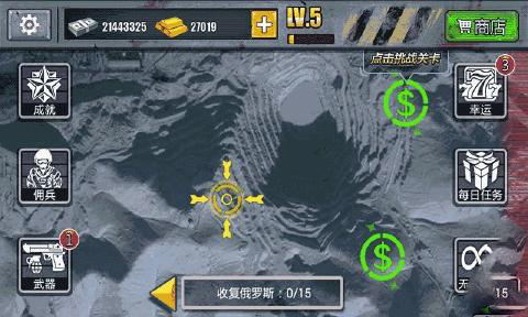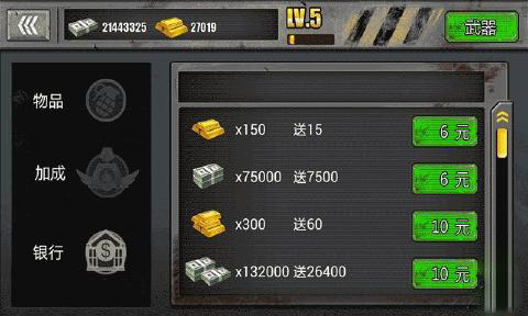 1、点击图标进入游戏,可以直接购买各种强力的武器招募佣兵;
