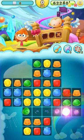 游戏玩法简单,只需将三个或三个以上相同颜色的果冻相连即可消除,游戏中还会出现坨坨怪兽,你需要将它们消除掉,才可以进入下一个关卡。还有丰富道具助力你的闯关之旅,一起来吧~