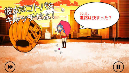《言叶的catch ball》是一款非常有创意的AVG游戏,从来没有见过这样的一款AVG游戏,非常的有创意。游戏模拟了在夕阳之下和女孩在河岸边一起玩catch ball的场景,一边游戏,你们一边交流,非常有画面感。选择你想要说的话,和棒球一起投向那个人吧!一共有7种不同的结局,根据她的话,做出你的反应,结局也会有所不同吧,有时候,不接住球可能会有新的展开哦!?