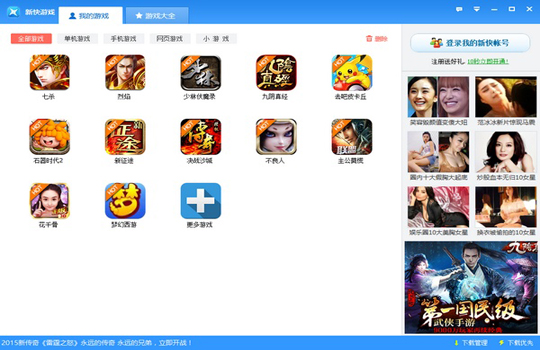 新快游戏盒子是一款非常给力的游戏盒子,它为用户提供了最新最热的单机游戏一键下载安装,并且用户可以轻松的管理已经下载完成的游戏与正在下载的游戏,支持设定下载完成后自动关机,并且还为用户提供了丰富的网络游戏与丰富的网页游戏开服表查看,支持用户在“我的游戏”中查看最近玩过和自己下载了的游戏,支持用户自定义分组管理已经下载完成了的游戏,并且支持用户智能设定下载模式,支持用户在下载优先、智能上网、自定义限速之间进行切换,非常方便。