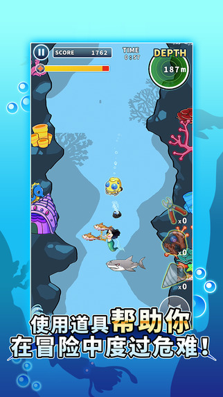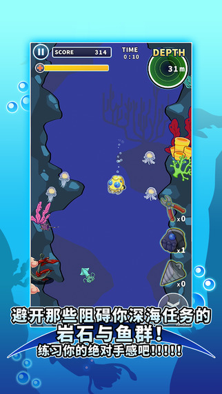 游戏的最大特色就是体感重力操作,玩家在控制潜水艇下潜至深海的同时也要学会灵活使用刹车来避开障碍,控制前进速度,让闯关更加安全顺利。此外游戏还会提供辅助道具让玩家使用,其中包括补血的、破开障碍的,玩家可以更加轻松地享受游戏的趣味性和休闲性。