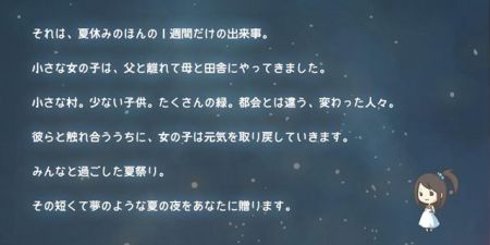 这次的主题仍然是“昭和”,在游戏中,玩家将穿越到举行着夏祭り(夏季的各种庙会)的昭和时代的某个小镇,这里有美丽的夏夜的烟火、各种各样的零食小摊、穿着和服的人头攒动的街道……热闹的夏祭り的景象,将再一次唤起玩家浓浓的怀旧感和思乡之情。