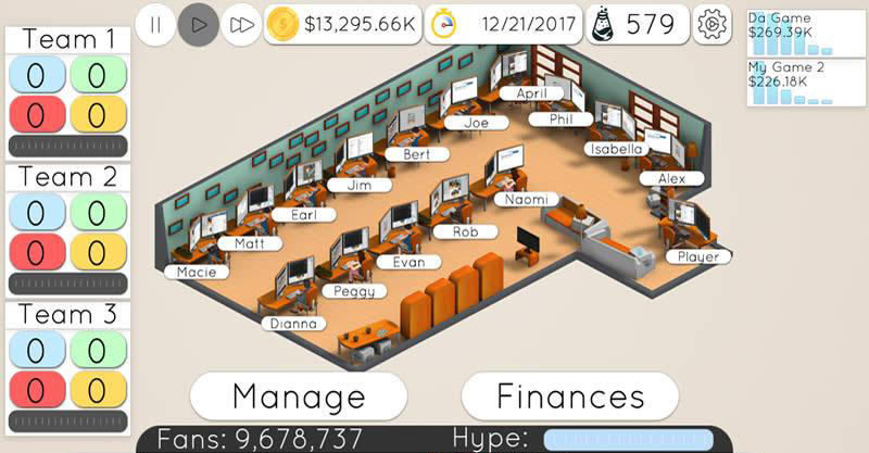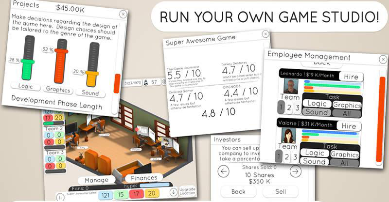 管理你的工作室的每一个细节!雇用员工,创建多达3个独立的团队,通过让投资者筹集资金,创造游戏,游戏机,以及更多!