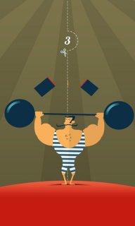《威猛先生》是一款休闲游戏,主角是一位举重运动员,他高举一个杠铃,头顶上有一个黑条在左右移动,玩家的任务是当黑条移到正中间时,用手指把它划开,将黑条分成平均的两半,落入两个杠铃上从而增加重量,只有两边重量平均才能让运动员保持站立!