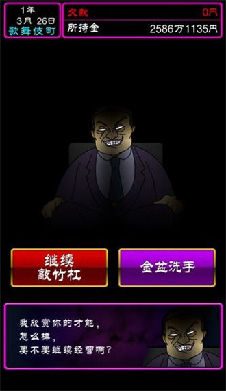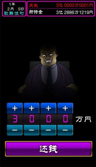 最开始的一亿还清后有两个选项,金盆洗手或者继续敲诈。我看有两个人物还没解锁,就选了继续敲诈,然后。。。债主让你再还三亿了(说是那一亿的利息)。。。本以为是二周目,还了三亿,又遇到了同样的两个选项= =再选继续敲诈,第二个三亿来了。。。话说一亿的利息三亿,三