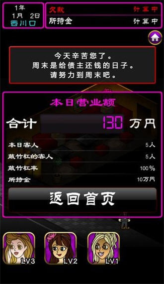 一天要经营8个小时,也就是8分钟,中间你的拉客人员会不断的拉客,你要做的就是分配服(陪)务(酒)人(小)员(姐),上菜和结账,这部分都和传统经营游戏相似。需要注意的是啤酒消耗非常快,需要每天及时补货。