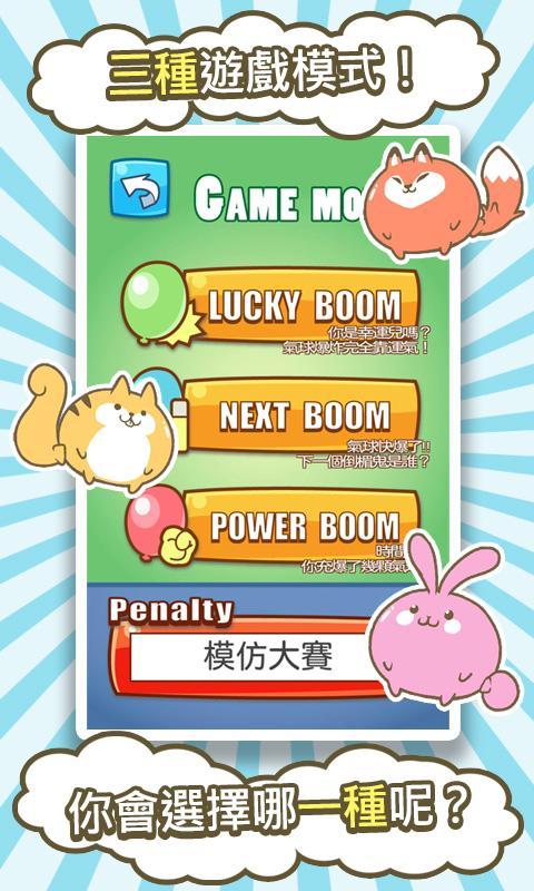 游戏中一共包括三大模式。其中幸运模式下考验的每个玩家单次吹气的量,吹得最少的人接受惩罚,下一个模式则是轮流吹气,最后一个把气球吹爆的玩家受到惩罚。剩下一个模式则是规则相反的爆破模式,比赛每位玩家在10秒内连续吹爆气球的数量。