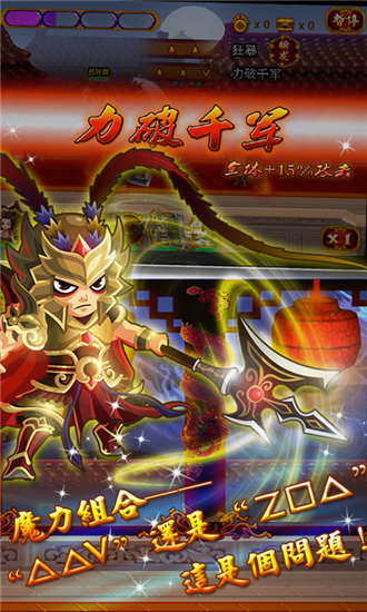 3.武将技能:所有武将都拥有一项武将技能,在副本战斗中技能CD满即可点击释放,PVP战斗中技能槽攒满后下回合自动释放。