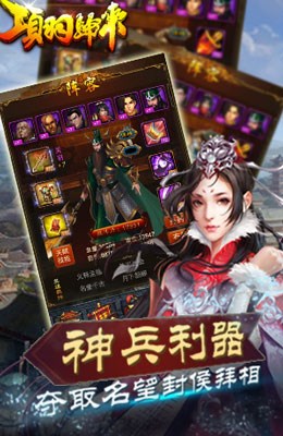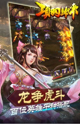 多元的英雄培养,庞大的装备系统,拍卖行、汉宫秘宝、竞技场兑换、皇陵探宝多种福利活动助君进阶武将,升级装备!还有竞技场、捍卫北疆、掠夺等丰富多样的PVP与夺宝玩法。让我们与项羽携手共进,争霸中原吧!!