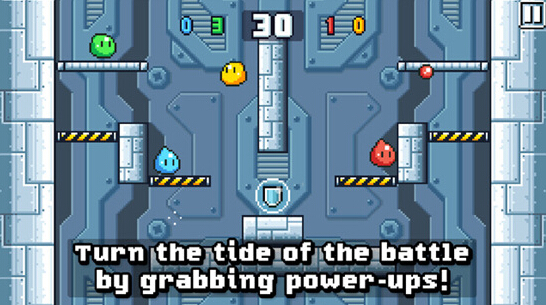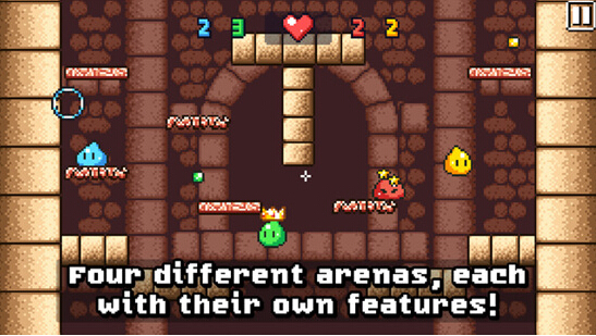战斗史莱姆(Battle Slimes)是一款多人在线动作游戏,允许最多4人同屏操作,屏幕中四只不同颜色的史莱姆将自动喷射火焰,当在撞墙后会反弹回来。玩家只能控制史莱姆做一个动作:跳跃,而目标就是用发射的火焰消灭其它玩家。游戏包括四个竞技
