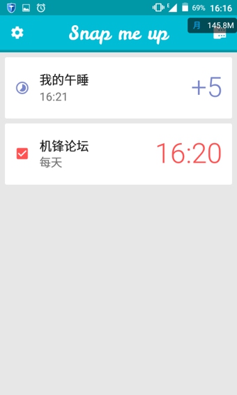 snap me up(刷脸闹钟)中文版:一款简洁大气的手机闹钟软件,比较有意思的是闹钟响起后用户必须对着自己的脸拍照才会停止响铃,让你想睡懒觉都没办法。