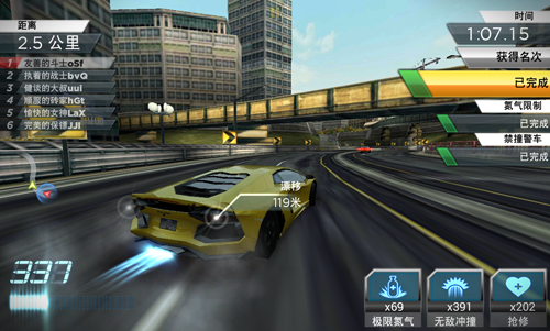 《极品飞车2015》拥有数十辆世界顶级正版授权豪车,兰博基尼、帕加尼等顶级品牌旗下的汽车型号应有尽有,游戏内100%还原豪车车型,满足玩家指尖豪车收集梦。这些豪车分为限量、超级、特级、高级、普通五个级别,随着玩家挑战不同赛事即可解锁这些豪车。驾驶上你心爱的超跑,听着引擎的轰鸣,漂移时轮胎和地面摩擦的声音,想想都十分带感!
