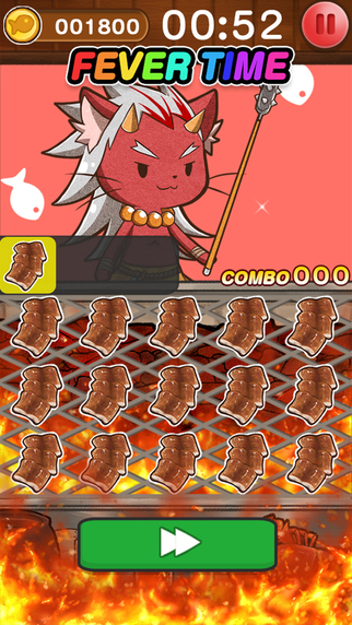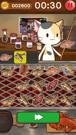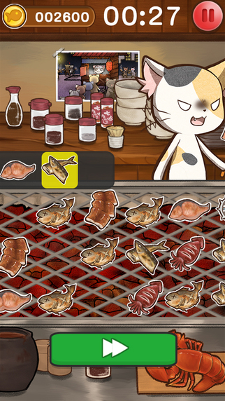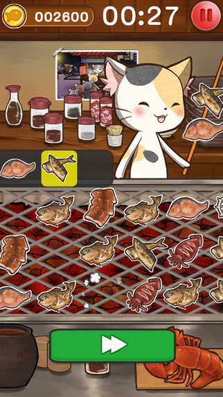 玩家每送出一只美味的鱼,喵客都会满足的回应喵叫声,尤其在快速送出鱼时,此起彼落的喵叫声,彷彿置身猫的王国般,产生让人误以为有猫在身边的临场感。每场游戏有 60 秒时间,只要将烤好的鱼选择绿色按钮送出,烤焦及没烤的生鱼选择红色按钮丢掉即可。需要注意的是,金色的鱼能增加游戏时间呢!