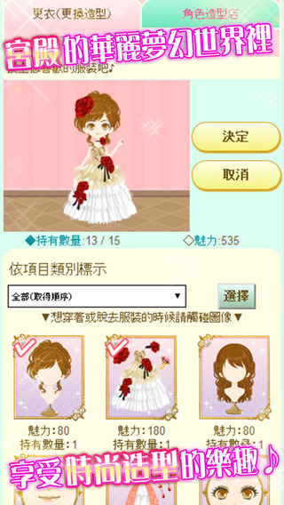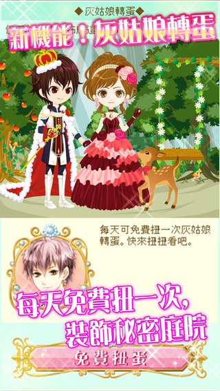 礼服、皇冠、玻璃鞋,你今天想如何装扮自己的公主时尚与王子约会呢?游戏中可自由为你的公主分身打造个人造型,多种造型道具,让你天天穿上不一样的礼服与王子约会,剧情中根据装扮的不同也会出现不同的对话喔!除了公主造型还可以设计王宫庭院,更特别增加王子的Q版分身,让你能与王子手牵手在庭院裡约会喔!想在什麽样的庭院与王子约会由你自己亲手打造!