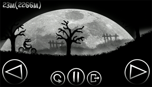 《天黑路难走》是一款风格特异休闲赛车游戏。在这个月黑风高的夜晚,狼人终于显出了真身,它骑上摩托车,开始在这个黑夜下疯狂奔驰。利用前进和后退键,来保持一定的行驶速度,并保证狼人不要摔下摩托。挑战一下你最远能到多少米吧。