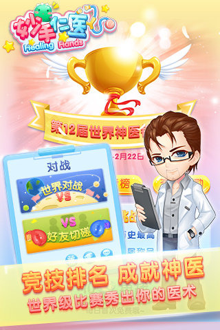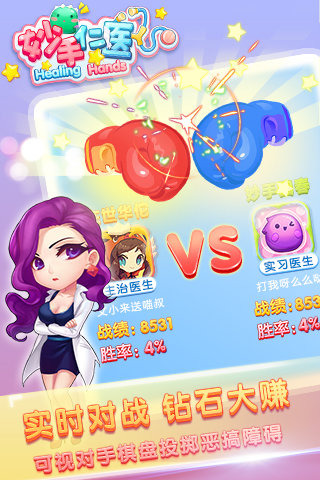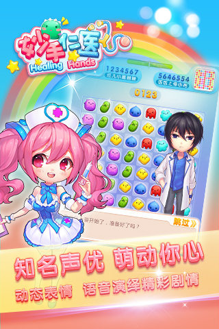 网易首款情侣三消手游《妙手仁医》居家旅行之良品,秀恩爱必备!激爽痛快的实时对战,挑战智商的医生锦标赛,丰富多变的巧妙关卡,让你消消消根本停不下来;Q萌可爱的游戏画面,升职领薪的成功之路,虐恋情深的剧情故事由知名声优倾情演绎,让你亲身体会医生的喜怒哀乐。不必摩擦,无需穿越,只要轻轻滑动手指,你就能踏上医界封神之路!
