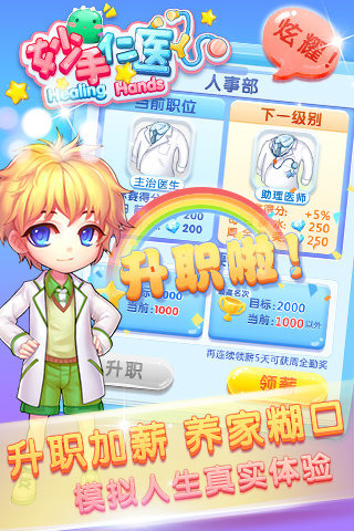 《妙手仁医》中有着“人事部”这一特色系统,收集剧情关卡获得的星星,挑战更高的神医锦标赛世界排名,即可提高医生职级,还可以在人事部中每天领取钻石薪水,连续一周领薪还有全勤奖呢!