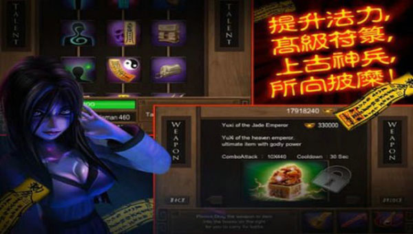 游戏中伴随着精美的音乐与声效,美丽性感的美女幽灵会领着玩家,战斗于多个不同的,各有特色的美丽中国古代3D背景当中,比如邪恶的古老迷宫,鬼哭连连的竹林,阴气森森的古代烟花青楼(性感的美女僵尸?),寺庙,村庄及长城等等各种关卡多不胜举。