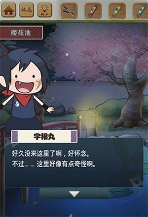 正式游戏是从樱花池开始的,先去武器库,查看被吊起来的蛤蟆老师,对话结束后前往竹林。