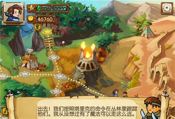 《勇者大陆》一改往日冒险类游戏或阴郁或跳脱的画面风格,采用了给人清新感十足的手绘画风,不管是从logo的设计,故事背景的对话还是关卡的选择,都像是看一幅幅手绘漫画一样,让人充满惊喜。而且在背景音乐的选择上,以轻快的节奏为主,战斗时会有所变化,让玩家感受到紧张的战斗气氛,弓箭手以及各种人物角色的音效也设计的很棒。