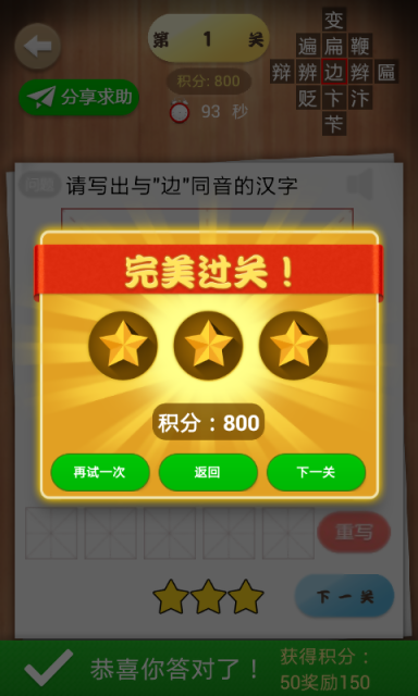 汉字英雄第二季新增玩法:写同音字。根据题目中的汉字,写出与其读音相同的汉字,四个音调均可。每写出一个正确的答案就会自动填充到“汉字十三宫”中,每完成四个即可获得一颗星。每一关玩家拥有150秒的时间,每完成一个可获得5秒的额外时间奖励。