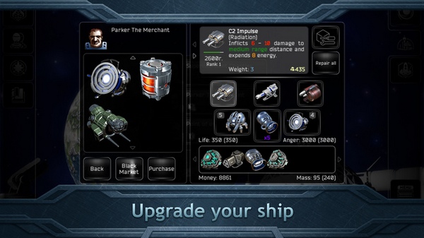 在游戏中,玩家起初只有一个勉强能起飞的飞船,玩家要通过探索、战斗等来获得更多的资源,最终玩家将会拥有一艘豪华的强大战舰,玩家还可以装备激光炮、导弹等武器,让自己的飞船更加强大,这样才能更方便的碾压外星人。