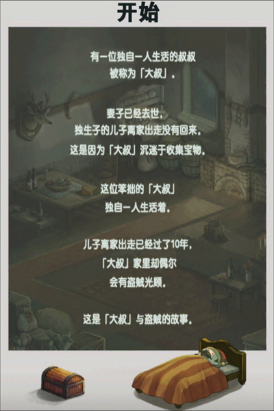 小小城镇的古老的家中,住着独自一人寂寞生活的大叔。而有一天,大叔家里来了盗贼……这是关于大叔与盗贼两个人的治愈人心的故事。用简单的点击操作可爱的「盗贼」,突破「大叔」的陷阱,得到他的宝物吧!