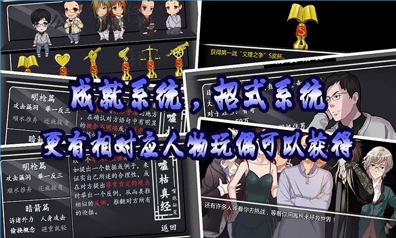 嘴炮大作战是一款极具橙光游戏代表性的AVG文字冒险游戏,游戏以类似弹丸论破,逆转裁判等的设定,讲述三国时期流传下来的门派,以口为刀,以脑为剑,不动兵戈,专事与人辩论。主人公诸葛辩是诸葛亮的第六十三代传人,肩负着振兴门派的使命,在得承门派秘笈后,他踏上了与各类名人辩论的旅程。